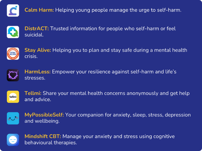 Here are some of our top picks for self-help apps for your phone. Topics include self-harm, suicide and mental health crisis, anxiety, general mental wellbeing, alcohol use and personal safety.